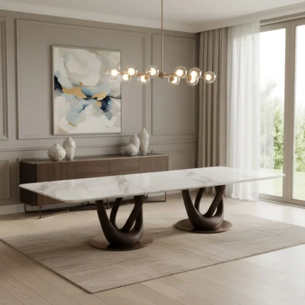 The neutral palette makes it easy to style. Earthy tones, soft fabrics, and contemporary décor blend seamlessly with this table’s gentle design. It sits beautifully under pendant lights and pairs naturally with curved or upholstered dining chairs. In open spaces, Ambera becomes the calm center that anchors your dining experience.